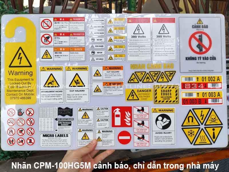 Nhãn chỉ dẫn vận hành: In nhãn cho các nút điều khiển, công tắc khẩn cấp, đèn báo trạng thái (Bật, Tắt, Dừng khẩn).
